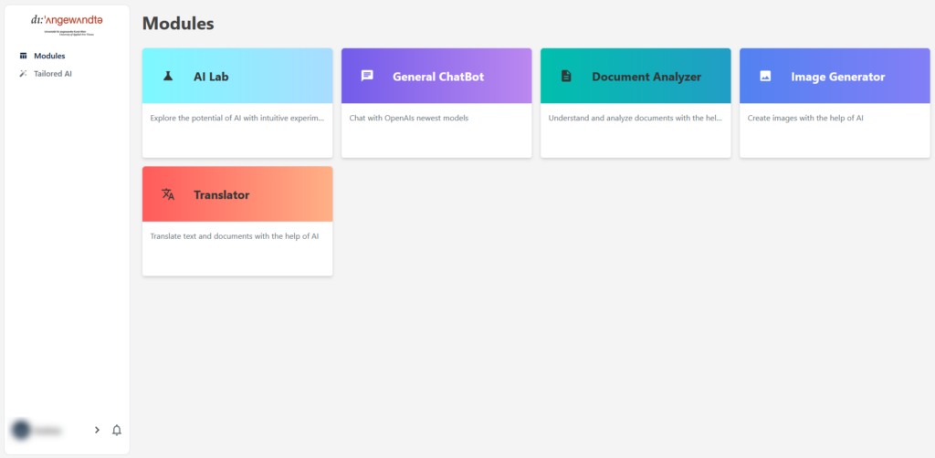 A general chatbot for research, text processing, and image analysis; document analysis for evaluating and summarizing uploaded files; an image generator for creating visual content; a translator for texts and documents in over 100 languages; the AI Lab for advanced settings and testing; and Tailored AI for creating your own specialized chatbots based on a document knowledge base.