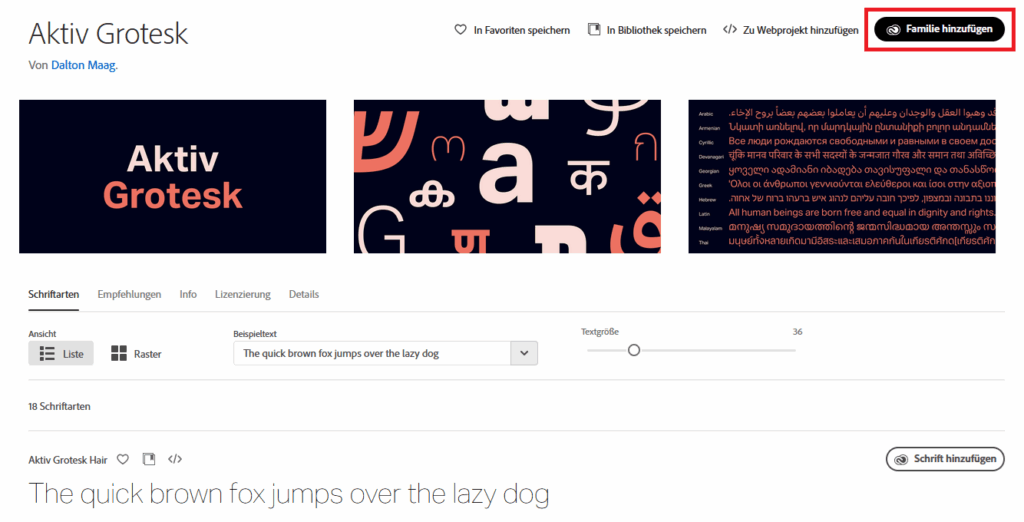 Anschließend suchen Sie nach der gewünschten Schrift zum Beispiel Aktiv Grotesk. Den Link zur Schriftfamilie Aktiv Grotesk finden Sie HIER.