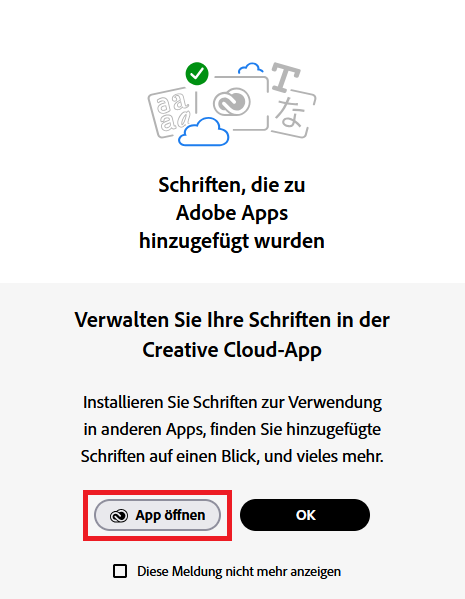 Mittels Adobe Fonts kann eine Vielzahl von Schriften, zur Verwendung in den Adobe Programmen oder auch Microsoft Office, hinzugefügt werden. Gehen Sie dafür auf die Adobe Fonts Webseite oder öffnen Sie Ihren Adobe Creative Cloud Client. Über den Creative Cloud Client werden Sie dann ebenfalls auf die Adobe Fonts Webseite weitergeleitet.