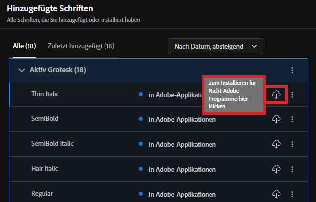 Die Schriftart sollte nun im Creative Cloud Client sichtbar sein. Die Schrift kann nun in allen Adobe Applikationen verwendet werden. Wird die Schrift auch in anderen Programmen benötigt, dann klicken Sie auf das Wolken-Symbol rechts neben der Schrift. Damit wird die Schrift auch für andere Programme (z.B.: Office) installiert.