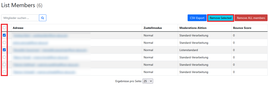 Mitglieder können direkt über die Mitgliederliste entfernt werden. Dafür wählen Sie die betreffenden Personen aus und klicken anschließend auf “Remove Selected”.
