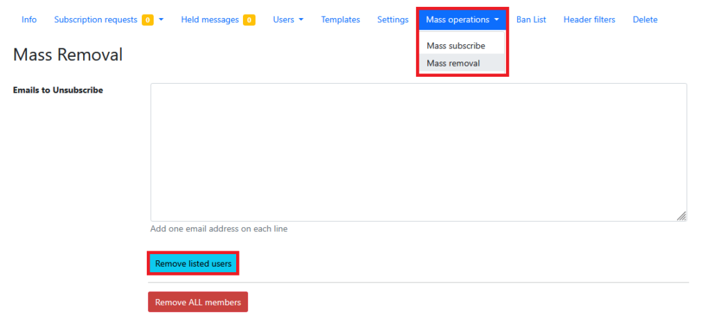 Auf der Web-Oberfläche wählen Sie den Punkt “Massenoperationen” und danach den Unterpunkt “Massenaustragung”. In dem leeren Textfeld können Sie nun eine E-Mail Adresse pro Zeile eintragen.