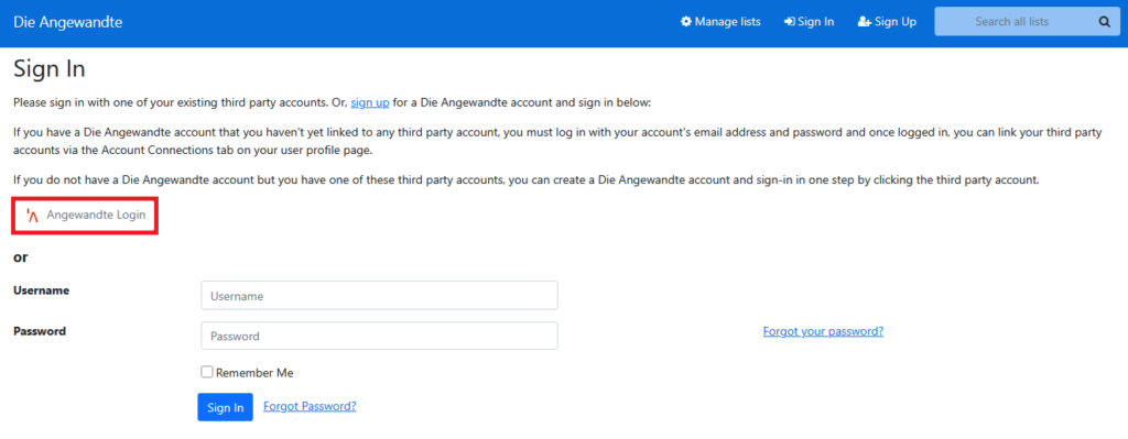 The login works with the p‑number and its associated Angewandte-Password. If the department is registered as an admin, then it uses the u‑number and its associated password. Use the “Angewandte Login” for signing in. You will then be redirected to a login page.